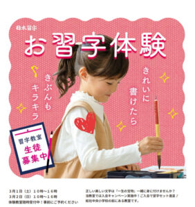 3月1日(土)と3月2日(日)に体験会を行います☆今回は硬筆や毛筆も体験していただければと思っております♫そして体験会に来てくださった方にはプレゼントも用意しております!!今回は土日に体験会を行います